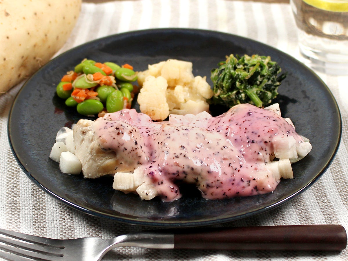 ふりかけでお馴染み、三島食品の「ゆかり」を使用したメニューの登場です!しっとり仕上げた鶏むね肉に、ゆかりを使用したピンク色が目を惹く、斬新なタルタルソースをかけました。スライスした玉ねぎとサイコロ状にカットした長芋を添えています。