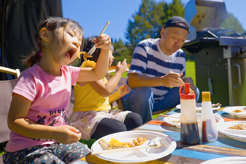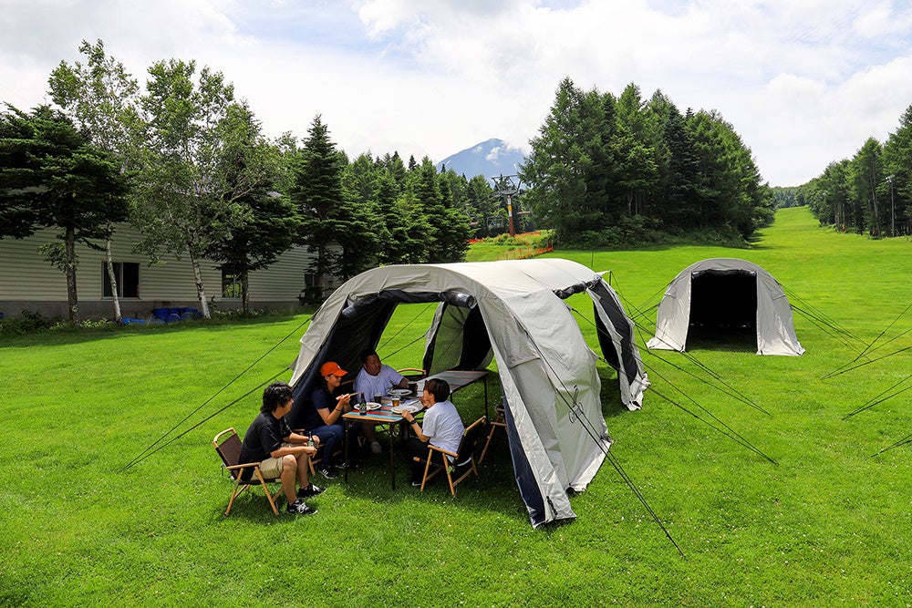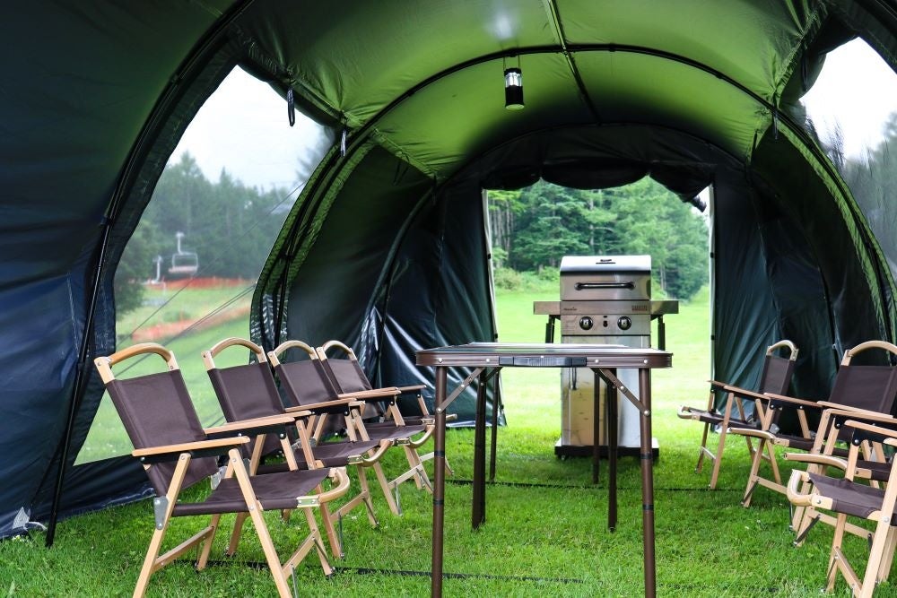 ゲレンデに設営されたかまぼこ型テントと高性能のバーナーグリルを使用して行うデイキャンプスタイルのBBQです。BBQに必要な機材は全てそろっており、食材も事前に予約注文できるため手ぶらで楽しむことができます。注文できる食材セットは、富士桜ポークをはじめ地元食材を使用したボリュームのあるセットをご用意しました。その他キッズセットもあるためファミリーでの利用に最適です。