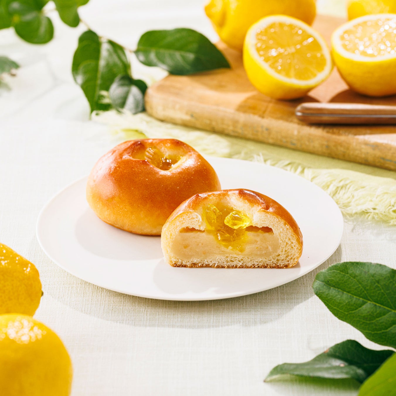 爽やかな香りとやさしい酸味のれもん餡にみずみずしいレモンゼリーを合わせ、酒種生地で包みました。(瀬戸内産れもん使用)