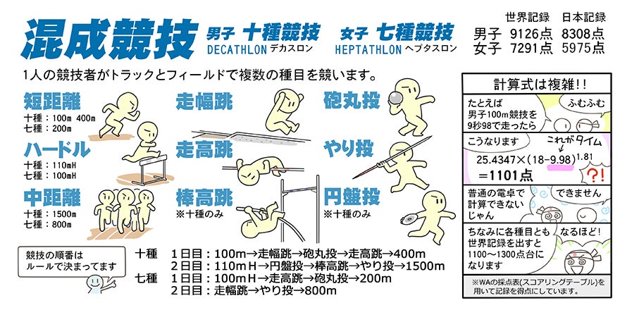 混成競技は走・投・跳から構成される複数の種目を1人の選手が行う競技。各種目の合計得点で順位を競います。