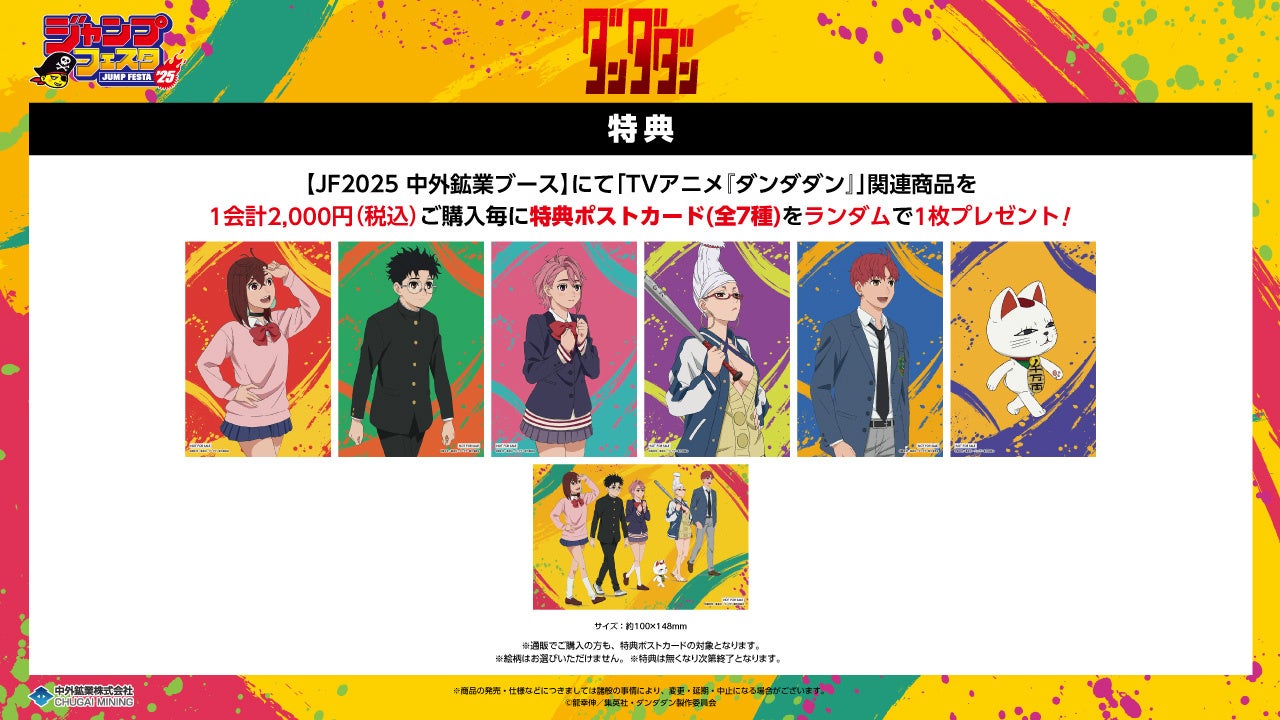 中外鉱業ブースにてTVアニメ『ダンダダン』JF2025関連商品を1会計2,000円(税込)ご購入毎に、特典ポストカード(全7種)をランダムで1枚プレゼントします。