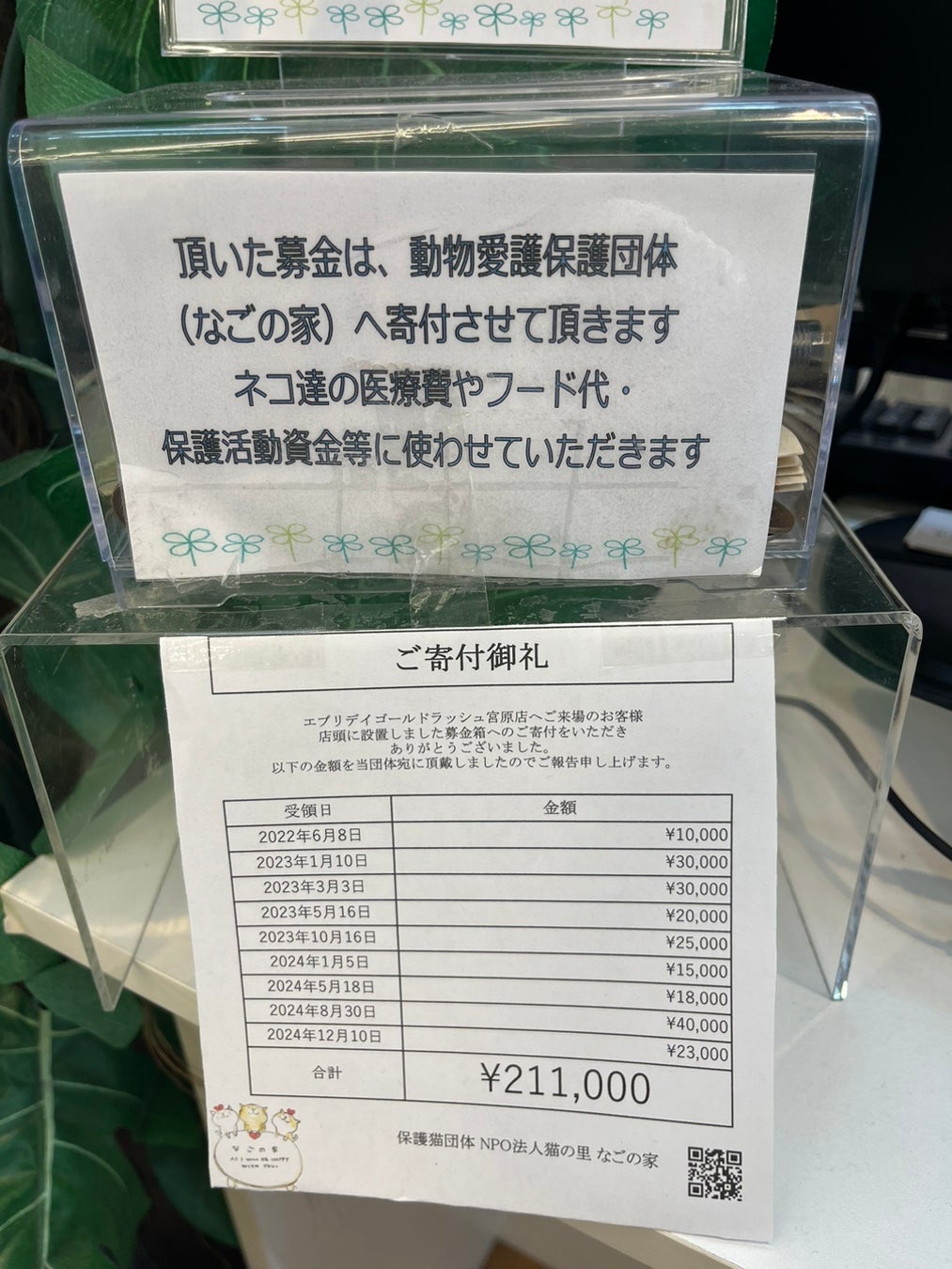 また、毎月1回の譲渡会開催だけでなく、エブリデイゴールドラッシュ各店には、保護猫支援活動に対する募金箱が常設されており、支援活動に賛同くださったお客様より募金を頂いております。