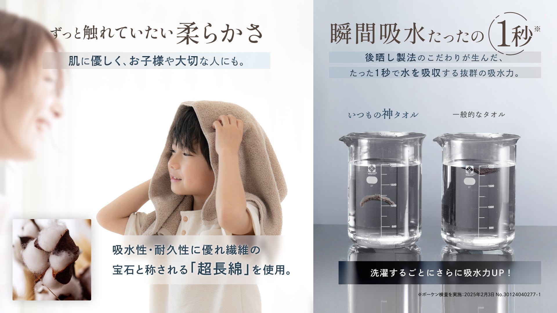 驚くほどの吸水力と、ふんわり軽やかな使い心地が特長のタオル。後晒し製法により、わずか1秒で水を吸収する抜群の機能性を実現しました。さらに、毛羽落ち率0.2%の特殊なコーマ糸を採用し、洗濯後もふわふわ感が持続。軽くて速乾性があり、毎日の洗濯や収納もスムーズです。肌に優しく、お子様から大人まで安心して使用可能。普段使いに最適な「いつもの神タオル」で、忙しい毎日をもっと快適に。