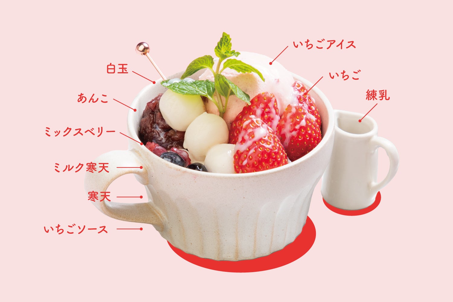 大きめのカップには、寒天・ミルク寒天・あんこ・白玉など、おなじみのあんみつの内容に加え、いちごアイス、フレッシュな苺に別添えの練乳をたっぷりかけてお楽しみいただけます。
