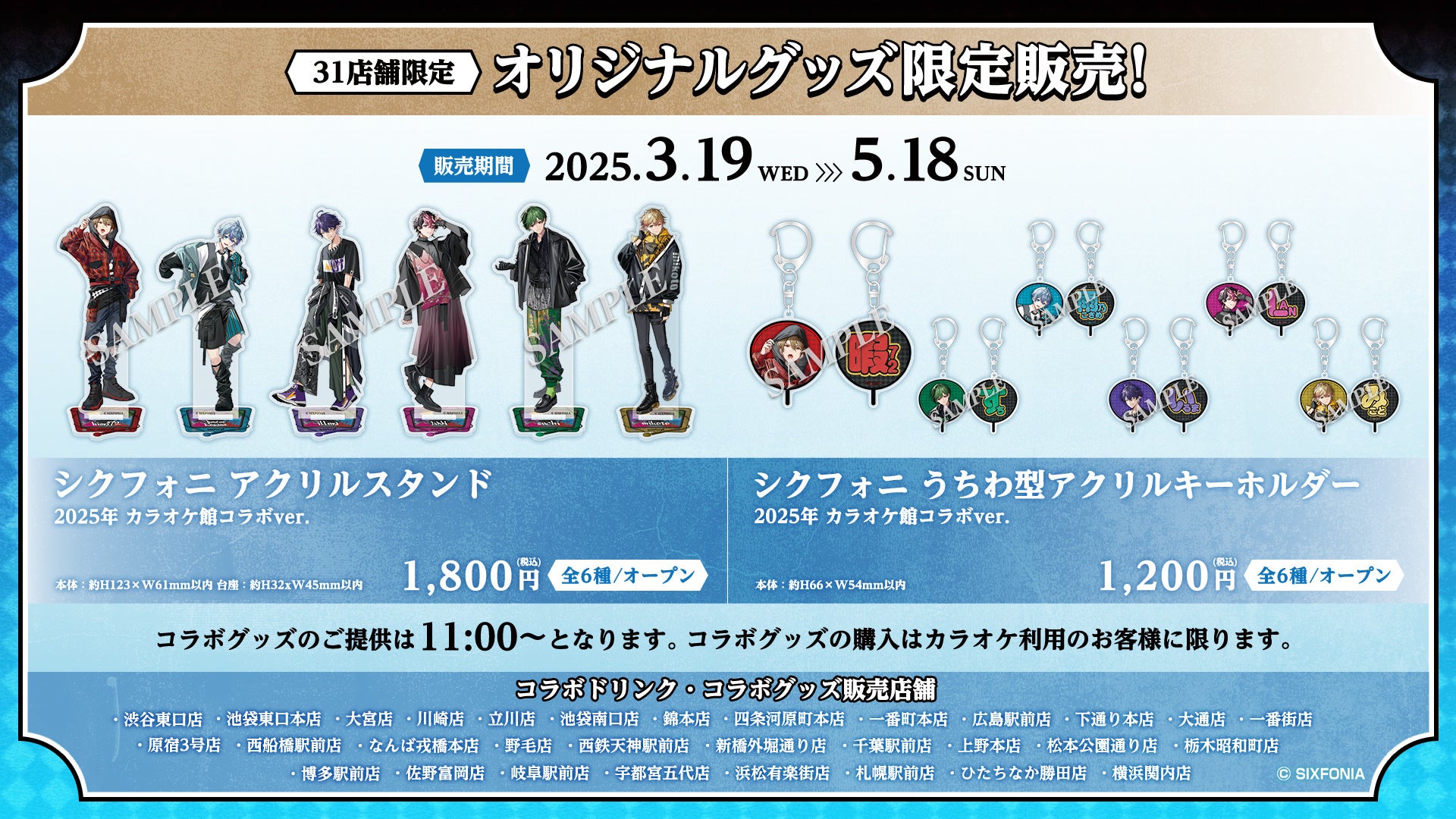 今回のシクフォニ×カラオケ館コラボでしか手に入らない限定アイテムが31店舗で販売。「アクリルスタンド」と「うちわ型アクリルチャーム」はファンにとってはぜひ手に入れたいグッズ展開となっております。