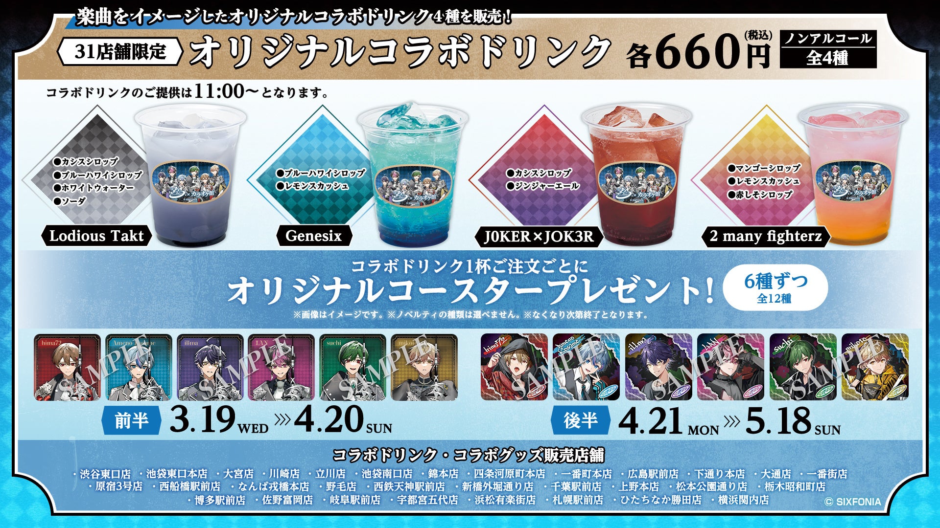 今回の1stライブツアーリード曲「Lodious Takt」をはじめとした、シクフォニ人気楽曲「Genesix」「J0KER×JOK3R」「2 many fighterz」の4曲をイメージしたオリジナルコラボドリンク4種が全国のカラオケ館31店舗にて販売されます。さらに、オリジナルコラボドリンクを注文したお客様には、オリジナルコースターをランダムでプレゼント。コースターには、開催期間前半と後半で異なるデザインが用意されており、前半の3月19日~4月20日はシクフォニのライブリード曲「Lodious Takt」をモチーフにしたデザイン、後半の4月21日~5月18日は描き下ろしイラストのデザインとなっております。