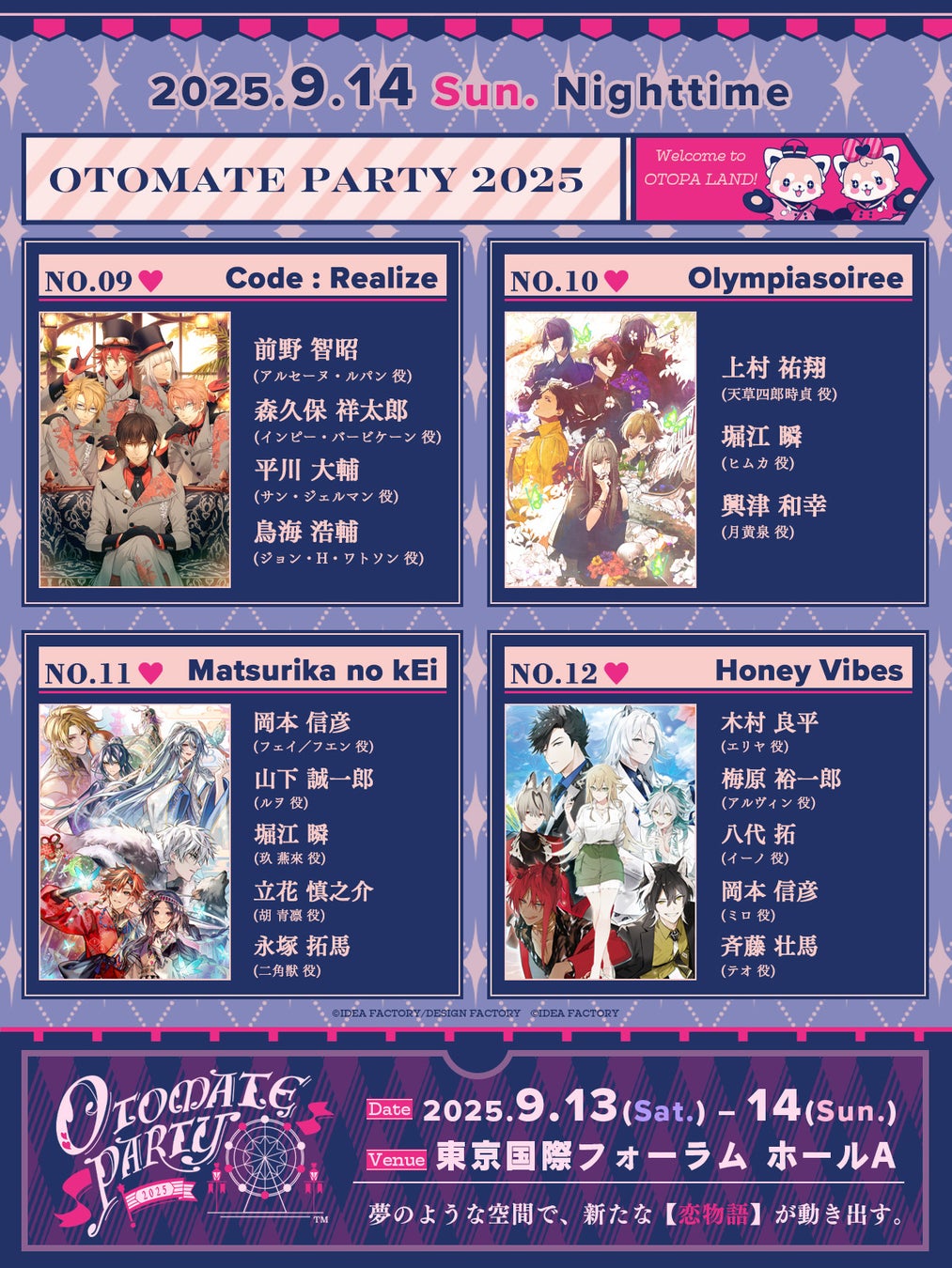 往年の人気作である「薄桜鬼 真改」「Code:Realize」、そして発売5周年を迎えた「オランピアソワレ」「キューピット・パラサイト」、さらにはイベント初ラインナップとなる「オトメイト」注目の新作「ミストニアの翅望 -The Lost Delight-」「Honey Vibes」まで見どころ満載の12作品をラインナップ!