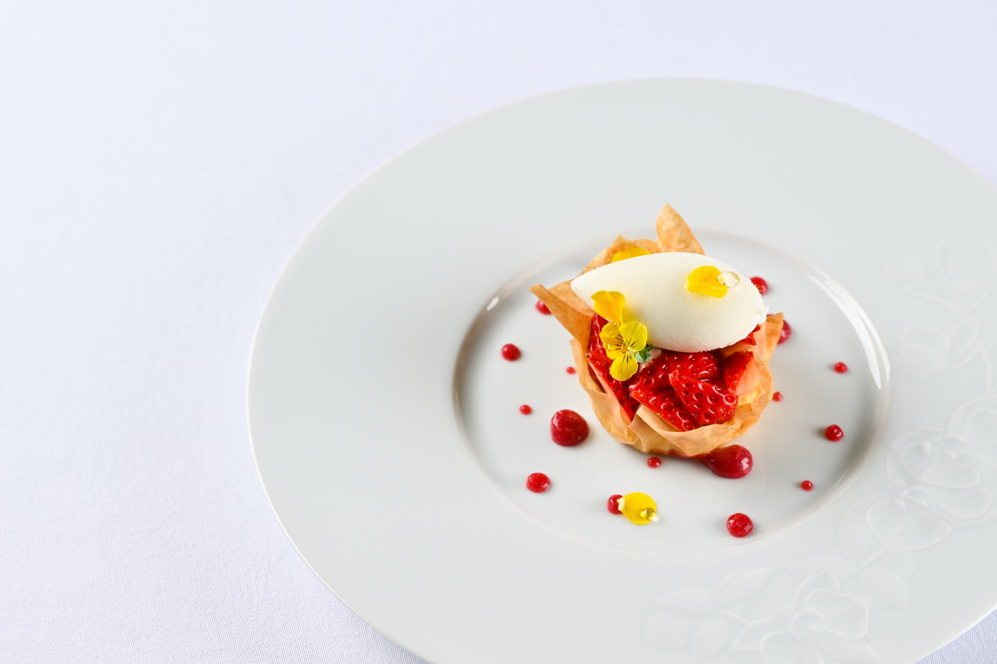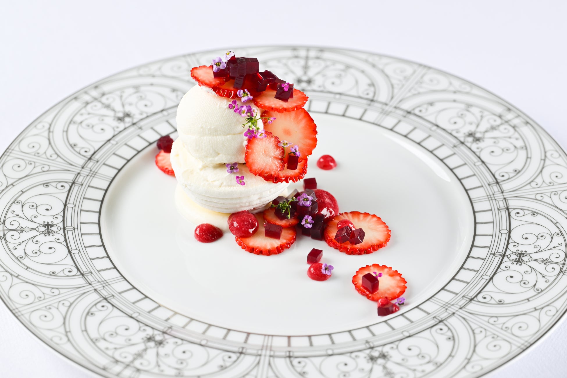サクサクのメレンゲの中に、八ヶ岳の農園直送の苺と香り高いシャンパーニュを合わせたソルベと、軽やかな口当たりのクレームダンジュを重ねました。蓼科産リュバーブソースの酸味、信州ワインで作った宝石のような赤ワインのジュレ、エディブルフラワーが彩る、華やかな一皿です。