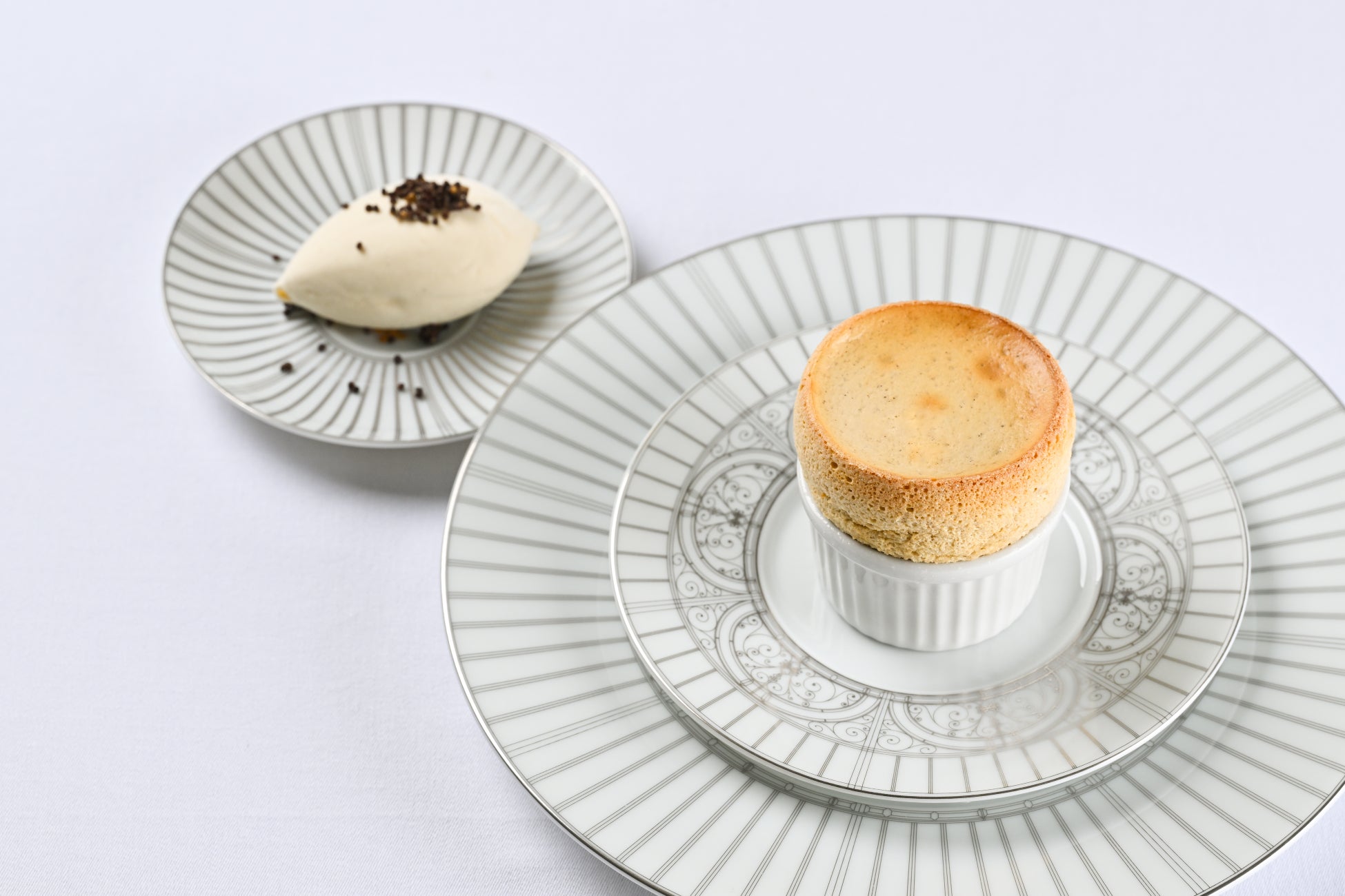 八ヶ岳の高原地帯から届く森の香り「白樺茶」をホワイトチョコレートと合わせ、軽やかに焼き上げたスフレ。メープルシロップのアイスクリームが白樺の香りを引き立てます。エゴマのキャラメリゼを食感のアクセントにお楽しみいただけます。