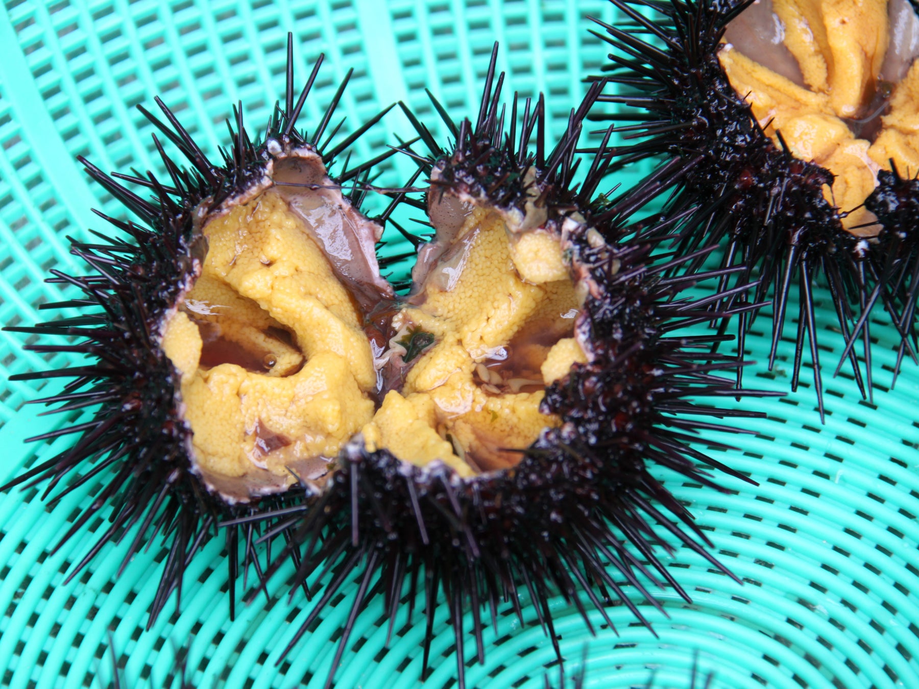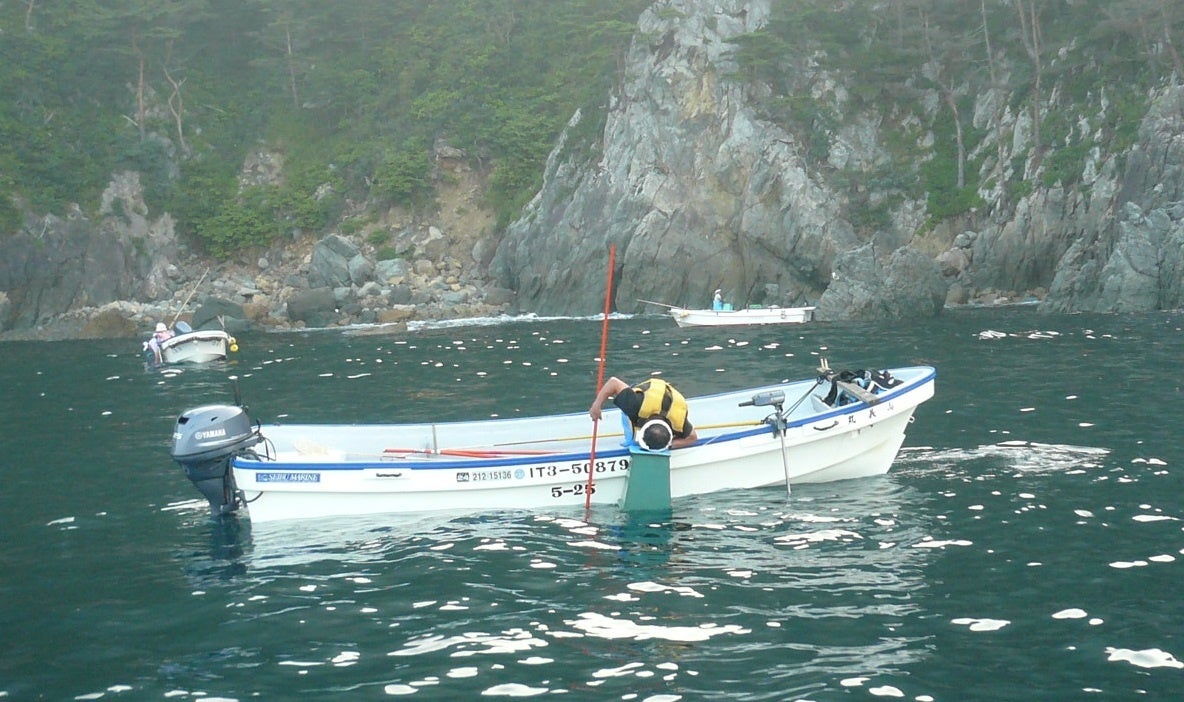 岩手県は北海道に続き本州一のウニの好漁場で、休暇村陸中宮古のある宮古市は主要産地のひとつです。三陸沿岸は、酸素量の多い親潮と山地から海へ流れ出る栄養豊富な水が混ざり合う豊かな海域、加えて昆布やわかめなど上質な海藻類の生息地であるため、ウニの育成に最適な環境です。「ウニの口開け」の日には夜明けとともに漁船が一斉に海に繰り出し、箱眼鏡を使用した伝統的な方法でウニを掬い上げます。