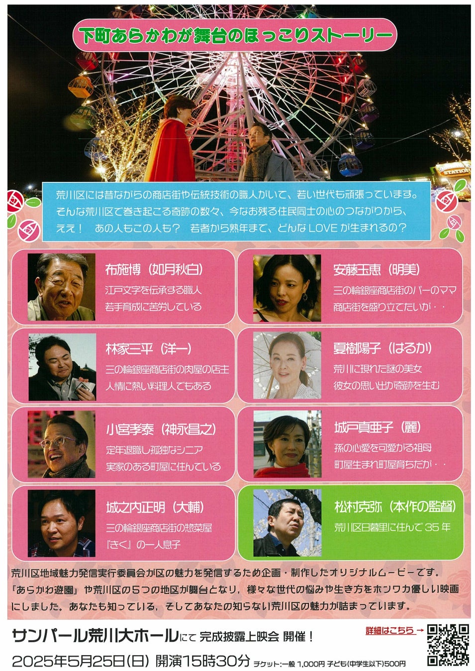 本作品は、荒川区との共催により荒川区地域魅力発信実行委員会が企画・制作した映画です。「あらかわ遊園」や荒川区の5つの地区を舞台に、様々な世代の様々な悩みや生き方をホンワカ優しく描いています。