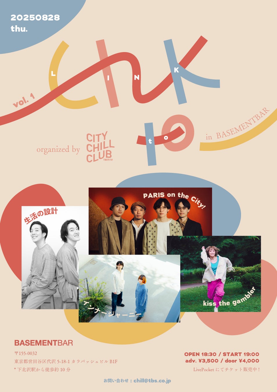 TBSラジオ『CITY CHILL CLUB』が下北沢BASEMENTBARと共催で若手アーティストのフックアップイベントを定期開催!8/28(木)は全4組が出演!インナージャーニー / kiss the gambler / 生活の設計 / PARIS on the City!