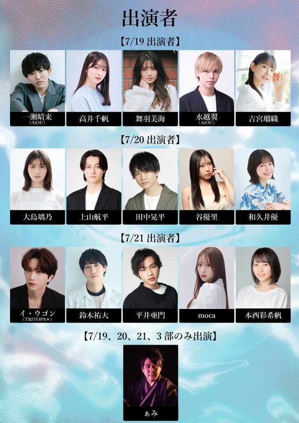 mocaが出演する7/21(月・祝)には、韓国人4人組男性ボーカルグループ「TRITOPS*」のメンバーで卓越した歌唱力でファンを魅了するほか俳優として舞台でも活躍するイ・ウゴン(TRITOPS*)・「ミュージカル忍たま乱太郎」シリーズなど数多くの舞台で活躍する鈴木祐大、俳優・モデル・シンガーソングライターと幅広く活躍し、現在はアニメ「UniteUp!」五十鈴川千紘役としても活動する平井亜門、ミュージカル『薄桜鬼 志譚』、『機動戦士ガンダム00 -破壊による覚醒』など2.5次元舞台をを中心に活躍する本西彩希帆が出演します。