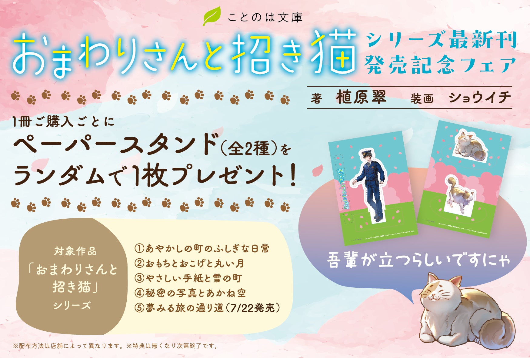 対象書籍:『おまわりさんと招き猫』シリーズ 1巻~最新刊5巻のいずれか1冊をご購入いただいたかたへ特典ペーパースタンドを1枚プレゼント!