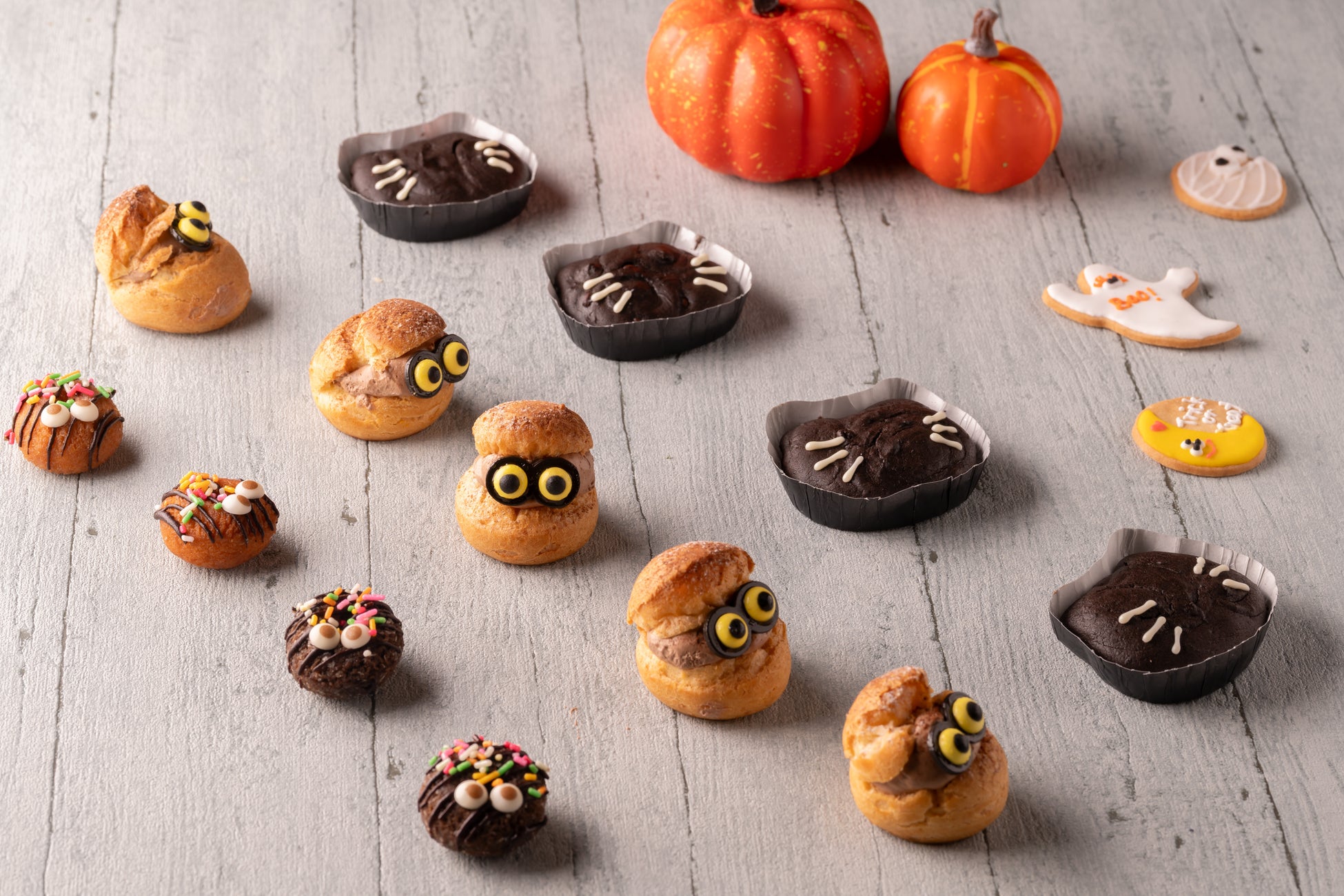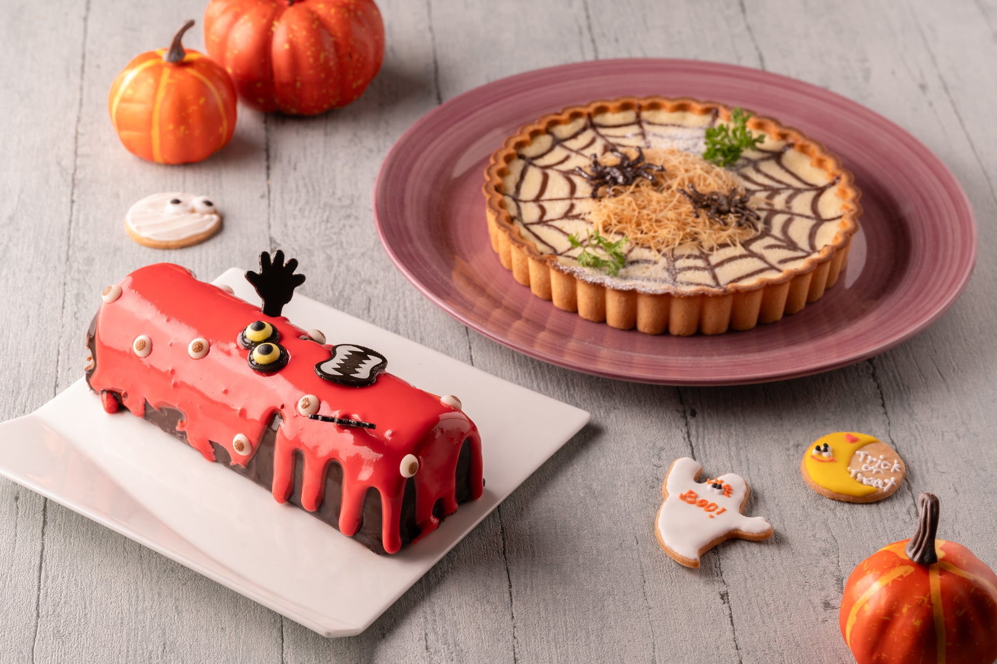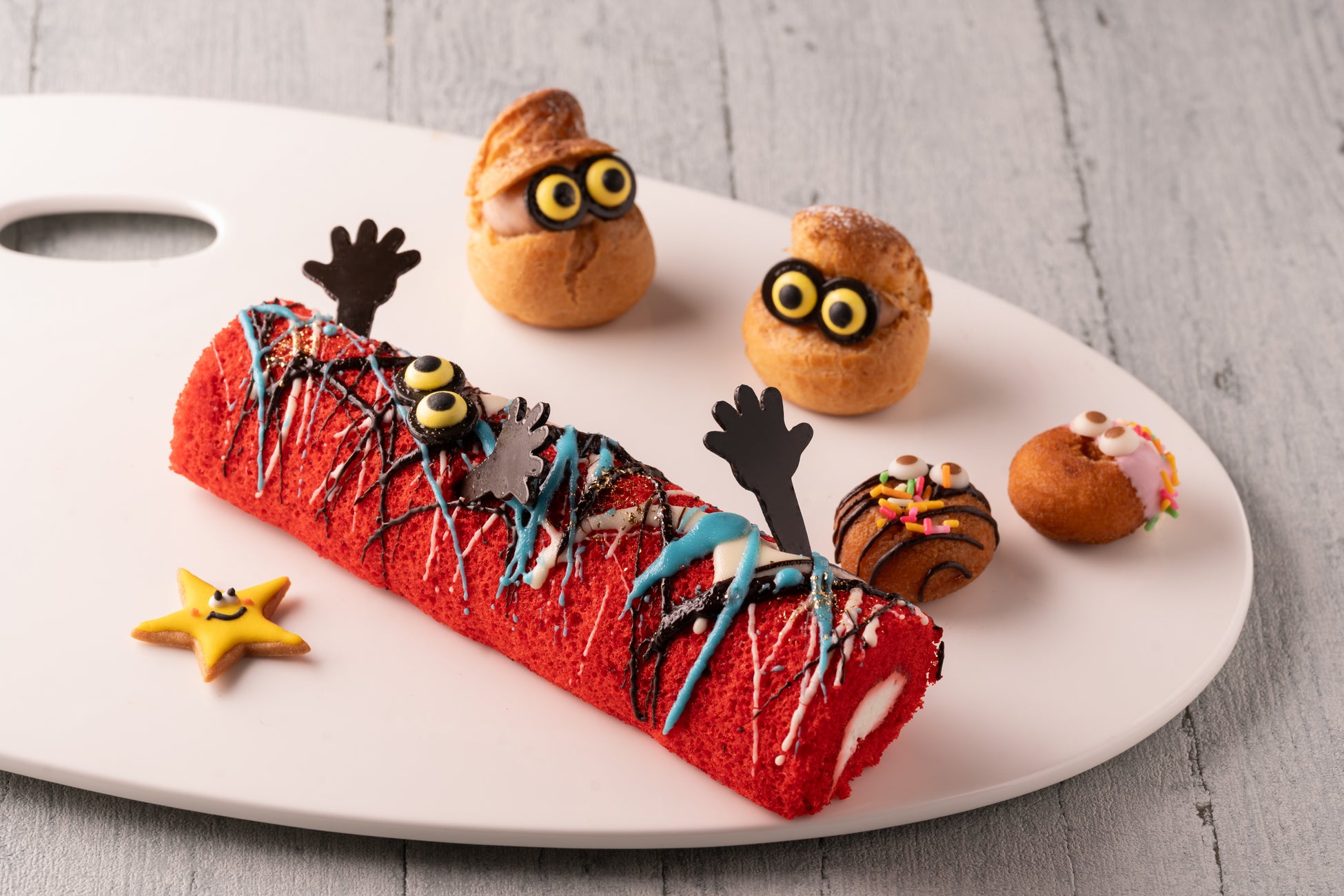 おばけが溶けたような「とろ~りおばけのチョコムース」や、真っ赤なスポンジに3色のチョコソースで旋律のような模様を描いた、アーティスティックな「おばけのロックンロールケーキ」など、遊び心あふれるスイーツがテーブルをカラフルに彩ります。