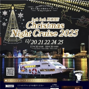 12月20日(土)~25日(木)(※23日は除く)、boh boh KOBE船上でクリスマスイベント『Christmas Night Cruise2025』を開催します!boh boh KOBEから歩いて10分のメリケンパークにも、クリスマスマーケット、イルミネーション、ドローンショーなどを楽しめる「Kobe Meriken Xmas – Christmas Drone Show」が開催!神戸港で特別なクリスマスを楽しみましょう♪