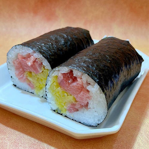 カラフルな食材を使用した断面も鮮やかな巻き寿司。人気のまぐろとサーモンがたっぷり入っています。