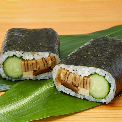 秘伝のタレで焼き上げた炭火焼うなぎと、そのタレで混ぜたご飯を海苔巻きにし、さらに玉子で巻き上げて三色巻に仕立てています。