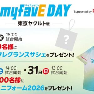 来場者プレゼントとして、5月30日(土)、31日(日)に『myfavEユニフォーム2026』を、5月29日(金)には「爽やか」な香りの『オリジナルフレグランスサシェ』を、当日の観戦チケットをお持ちの先着15,000名様にプレゼントいたします。