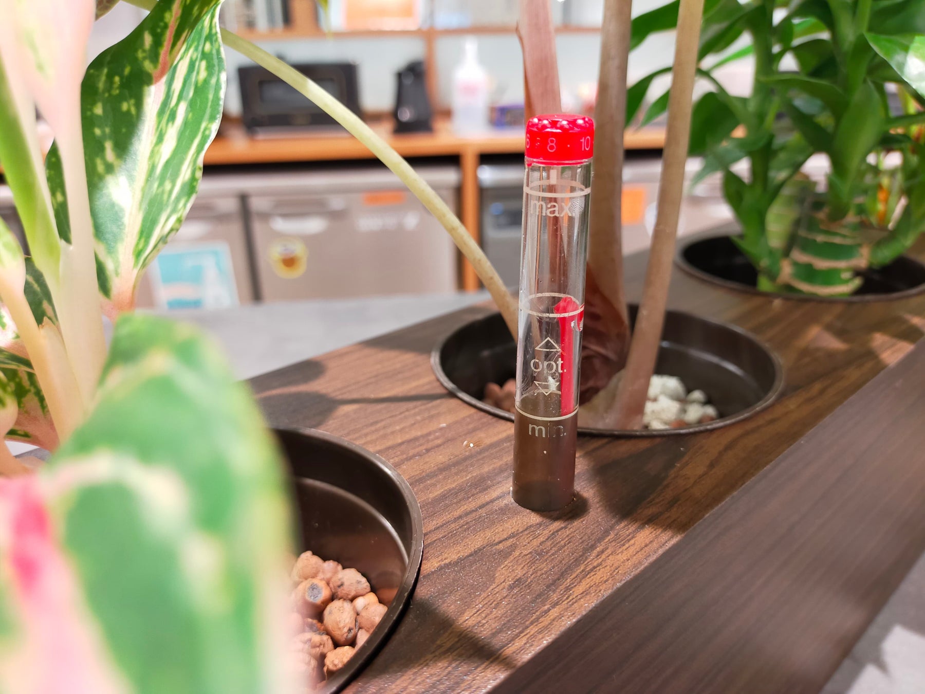 「Table Green」の最大の魅力は、メンテナンスのしやすさです。プランターには、水位計が設置してありますので、適切なタイミングで水やりができます。