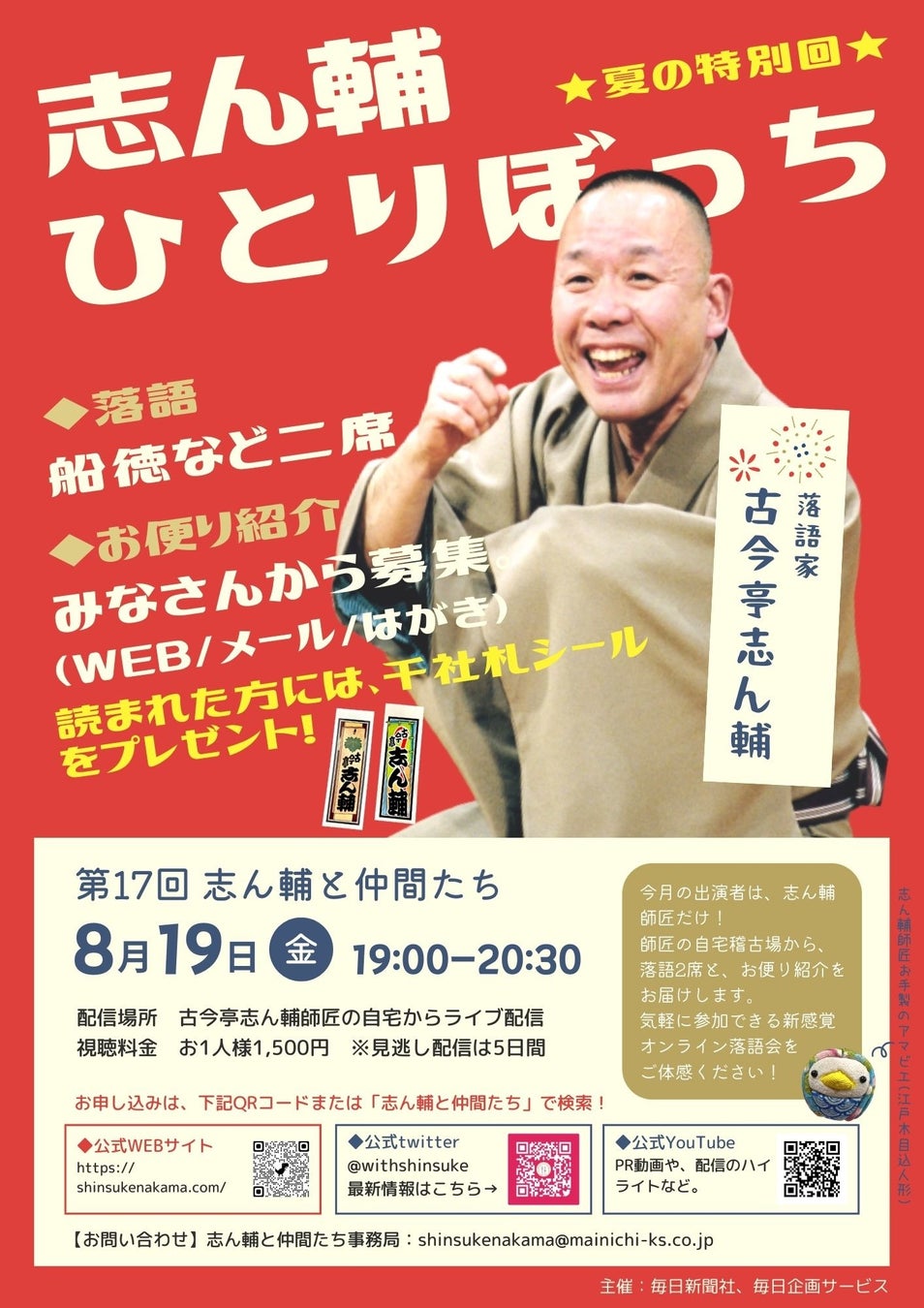 オンライン落語会「志ん輔と仲間たち」8月19日(金)第17回配信 夏の特別会「志ん輔」×「視聴者」 配信は「志ん輔ひとりぼっち」で。視聴者のお便りを紹介