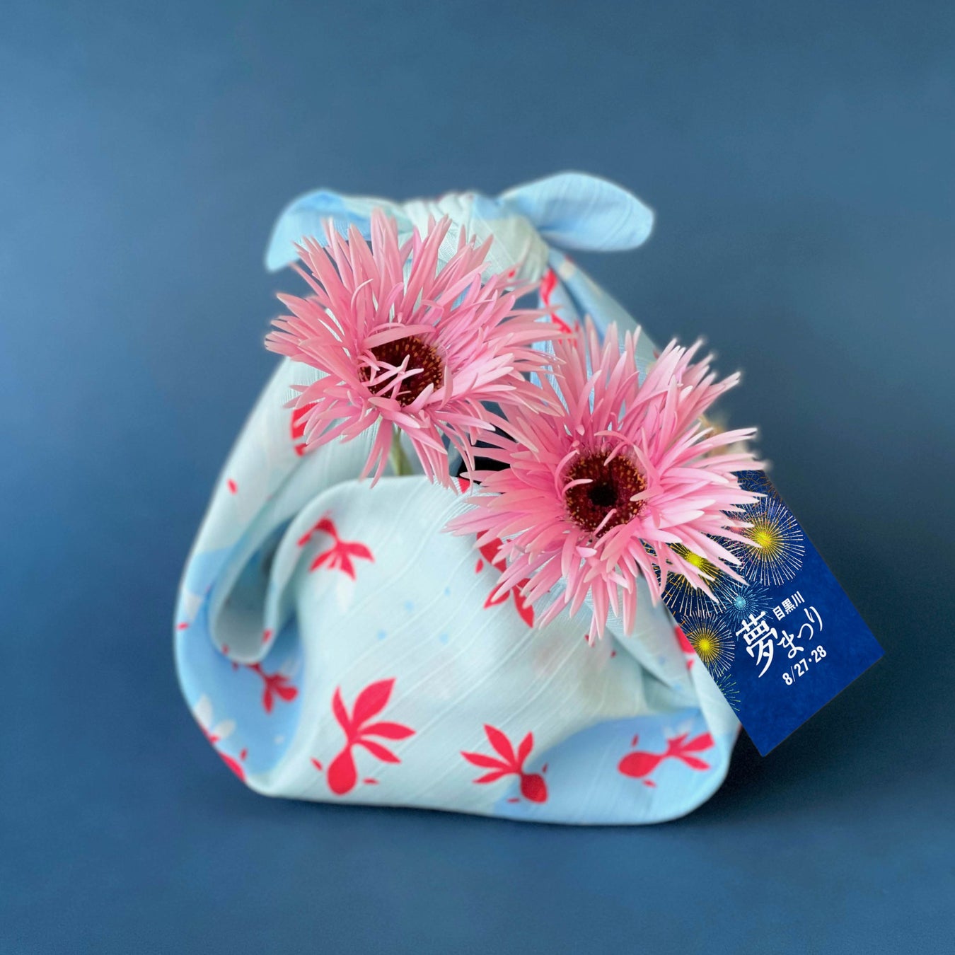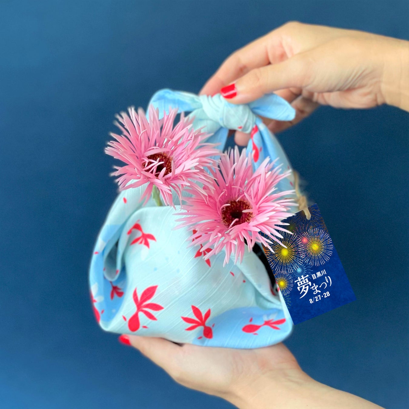 夜空に咲く花火のような咲き方の花をチョイスして、和柄のミニ風呂敷でラッピングした涼し気なアレンジメント。ミニ風呂敷はお弁当を包むのにもぴったりなサイズです。