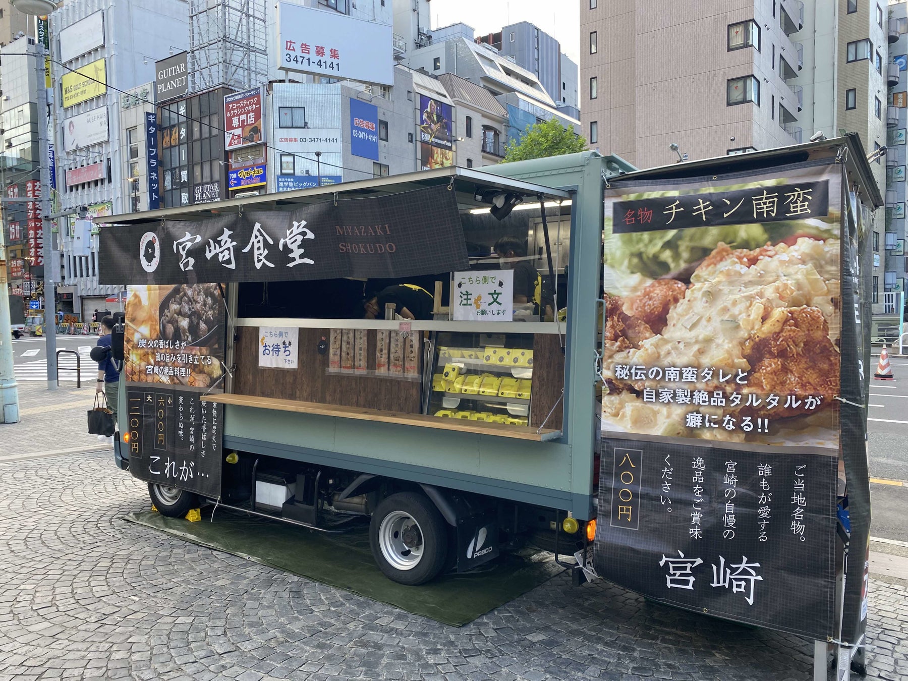 新宿みやざき館KONNEにやってくるキッチンカーでは、厳選した宮崎県産食材を使った「鶏炭火焼き」や「チキン南蛮」を提供します。宮崎のトマト・ピーマン・みやざきワンタッチきゅうり等を使った宮崎有田牧畜直送の「ひれステーキ串」も絶品です。