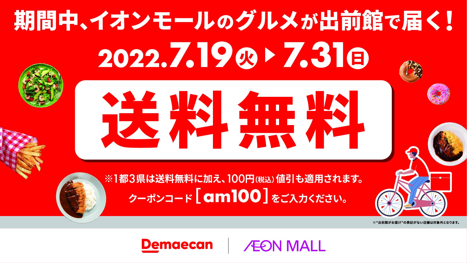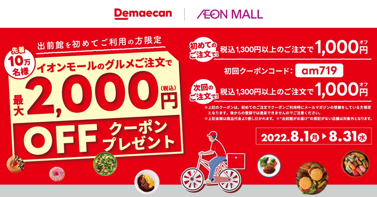 また、2022年7月19日(火)より、全国103か所のイオンモールを対象に、『出前館』に加盟する飲食店の送料が対象期間中、無料※となる合同販促キャンペーンを開催します。さらに2022年8月1日(月)より、『出前館』を初めてご利用のお客さまで対象店舗の注文をされた方に計2,000円オフとなるクーポンも配布いたします。