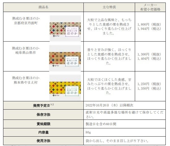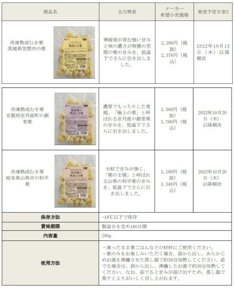 自然の甘さ引き立つ和栗を一番おいしい食べ方で手軽に熟成栗の2商品『熟成むき栗 ほのか』・『冷凍熟成むき栗』を発売 〜-2℃~0℃でゆっくりと自社熟成。皮むき不要で手軽に秋をいただく~